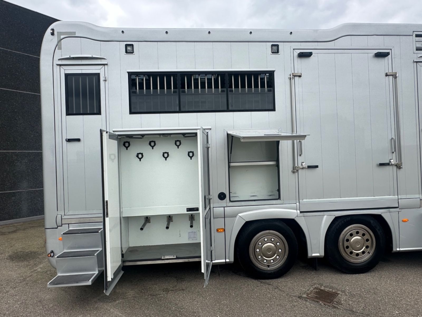 - Armoire sellerie à l’arrière descendant sous le châssis avec porte-selles et porte-filets